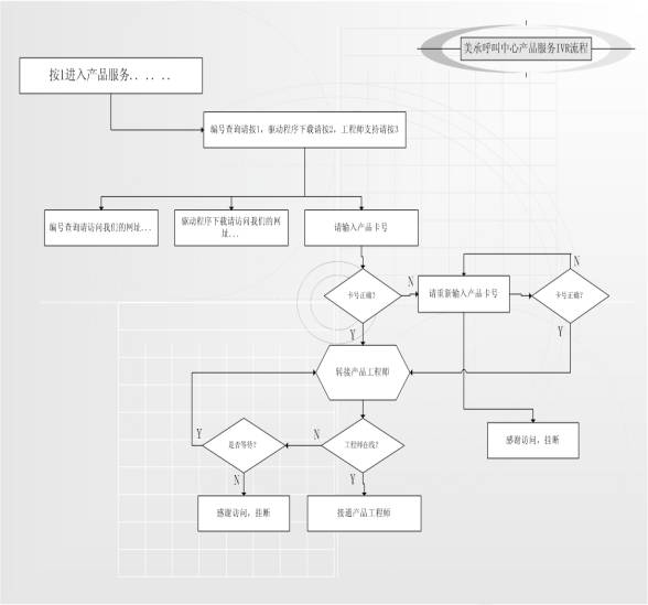 IVR系統(tǒng)是呼叫中心系統(tǒng)中極為重要的一環(huán)。作為面向用戶的窗口,IVR的語音交互方式引導(dǎo)用戶進入不同的業(yè)務(wù)流程,聽取相關(guān)信息。清晰,流暢,禮貌而又有層次的IVR語音會給用戶留下深刻的印象。美承的IVR系統(tǒng)在設(shè)計上參照了其他成功的客服中心的經(jīng)驗,充分考慮了用戶的習(xí)慣,在流程上具有鮮明的特點,以下以產(chǎn)品服務(wù)為例: