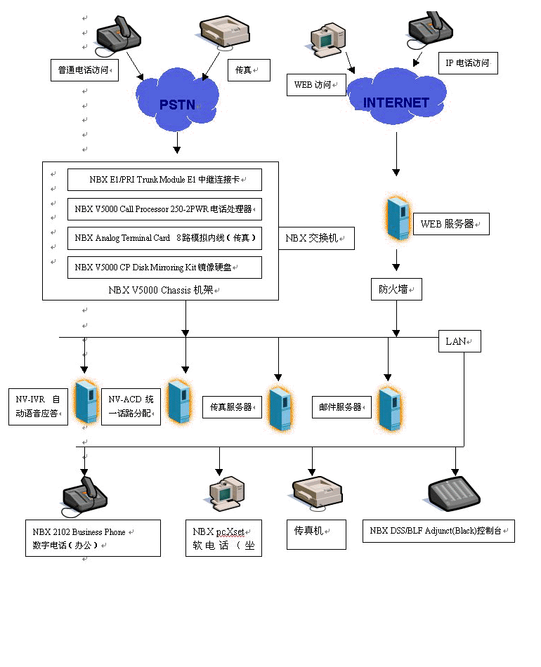 基于NBX的呼叫中心對外支持PSTN、IP兩種接入方式,可以實(shí)現(xiàn)各種接入:普通電話、傳真、IP電話、郵件、WEB訪問,NBX呼叫中心在技術(shù)上實(shí)現(xiàn)革命性的突破,在內(nèi)部實(shí)行語音數(shù)據(jù)兩網(wǎng)合一,從而實(shí)現(xiàn)外部各種訪問的統(tǒng)一路由分配。
