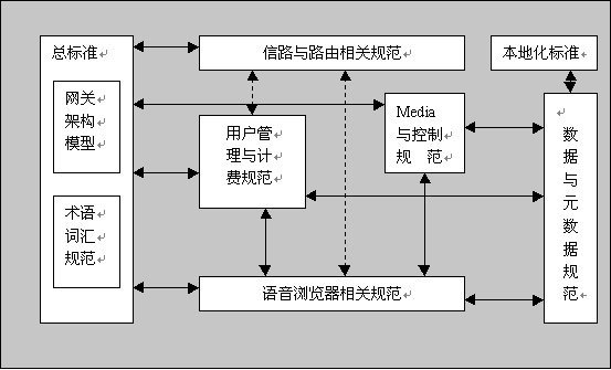 通過(guò)分析國(guó)際上各種語(yǔ)音網(wǎng)關(guān)系統(tǒng)極其技術(shù)規(guī)范,特別是參照 W3C組織的"Voice Browser" Activity的框架,我們認(rèn)為作為一個(gè)比較完整的語(yǔ)音網(wǎng)關(guān)標(biāo)準(zhǔn)體系,應(yīng)該包含以下具體標(biāo)準(zhǔn)規(guī)范的制定,通常稱之為標(biāo)準(zhǔn)需求。下圖顯示所需的規(guī)范類型及其相互關(guān)聯(lián)。