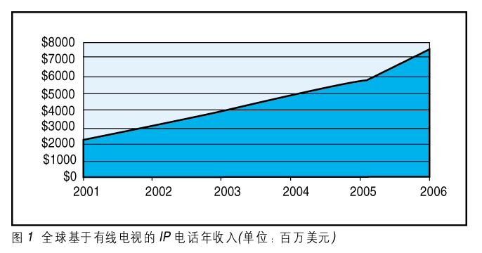 有線電視運營商在尋找使用有線電視基礎(chǔ)網(wǎng)絡(luò)HFC的新服務(wù),創(chuàng)造新的經(jīng)濟增長點,提供數(shù)據(jù)、語音、圖像綜合的服務(wù);谟芯電視系統(tǒng)的IP電話將是第一個最有可能推出的新服務(wù)。2002年InStat/MDR的分析報告說2006年基于有線電視的IP電話網(wǎng)將達到US$75億的年收入,如圖1所示。