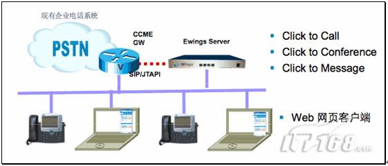 點(diǎn)點(diǎn)通系統(tǒng)配置一臺CISCO 2811集成多業(yè)務(wù)路由器設(shè)備,能提供CCME IP電話的支持,并且可以跟企業(yè)內(nèi)部的現(xiàn)有電話系統(tǒng)對接。另外,點(diǎn)點(diǎn)通系統(tǒng)還有一臺服務(wù)器,這是思科的合作伙伴提供的硬件和軟件,通過它實(shí)現(xiàn)和公司目錄的集成和各種對電話的控制功能。這臺服務(wù)器和CCME之間采用SIP或JTAPI的連接。