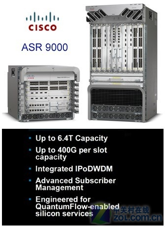 Cisco ASR-9000于2008年11月面市,提供6.4T總?cè)萘亢?00Gbps的單插槽容量,支持16*10 GE卡至320*100 GE卡或32*100 GE單系統(tǒng)。