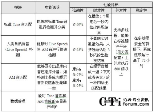 圖中,Tone音匹配采用模式匹配方法,可以實(shí)現(xiàn)對(duì)振鈴音,忙音,空號(hào),不可達(dá)音等100多種標(biāo)準(zhǔn)提示音的識(shí)別。AM(Answering Machine)音匹配主要負(fù)責(zé)識(shí)別傳真機(jī)、自動(dòng)答錄機(jī)等機(jī)器語(yǔ)音,同樣采用模式匹配方法,將收到的語(yǔ)音與標(biāo)準(zhǔn)樣本庫(kù)進(jìn)行比對(duì)。人類自然語(yǔ)音檢測(cè)的功能主要通過(guò)人真實(shí)聲音的檢測(cè),來(lái)判斷是否需要進(jìn)行語(yǔ)音匹配。