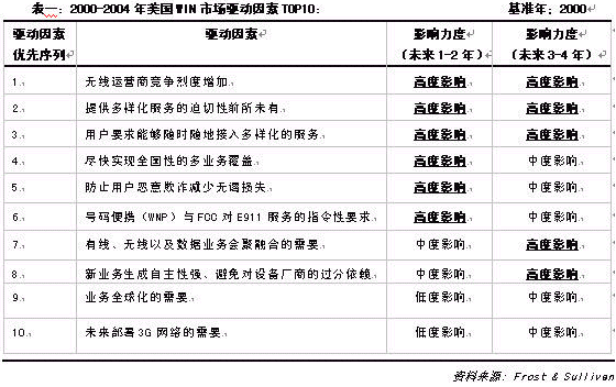 根據(jù)Frost & Sullivan 分析預(yù)測,2000-2004年美國WIN設(shè)備市場呈現(xiàn)相對(duì)均衡的發(fā)展趨勢,其TOP10的影響因素與影響力度見下表: