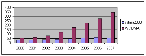 2000年,3G市場收入在cdma2000(大約31億美元,占38%)與WCDMA(大約50億美元,占62%)分布為1/3比2/3。我們不難看出,這種變化有利于WCDMA。到2007年,預(yù)計WCDMA將占全部市場收入的86%。這是由于對于WCDMA,運營商需要增加支出來將其網(wǎng)絡(luò)升級為GPRS、EDGE與WCDMA。同時,在預(yù)測期內(nèi),TDMA運營商最終要將其所有現(xiàn)存的TDMA與模擬特性升級為GSM/GPRS。相比之下,CDMA運營商處于良好的狀態(tài),其現(xiàn)有基礎(chǔ)設(shè)施的大部分軟件已經(jīng)升級。CDMA運營商,如Verizon,確實也有模擬特性,但是較之GSM/TDMA而言,它們要低得多。CDMA運營商支出的大部分將以新的Cell sites的形式出現(xiàn)的覆蓋率。