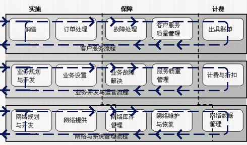 電信運(yùn)營乃至整個(gè)電信企業(yè)的經(jīng)營管理也越來越倚重于電信網(wǎng)絡(luò)支持系統(tǒng)。以最短的時(shí)間向用戶提供最新的業(yè)務(wù),對同一用戶提供豐富的消費(fèi)方式的選擇,對不同用戶進(jìn)行交叉銷售,乃至對價(jià)值鏈中的合作伙伴進(jìn)行有效管理,這些都要求業(yè)務(wù)管理與網(wǎng)絡(luò)體系的高度整合。西方的現(xiàn)代電信服務(wù)企業(yè),都紛紛以操作支持系統(tǒng)(OSS)的要求來規(guī)范自身企業(yè)的運(yùn)營,努力做到企業(yè)的每個(gè)業(yè)務(wù)操作都能在電信運(yùn)營導(dǎo)圖(TOM)中找到相應(yīng)的位置,而每個(gè)步驟和其他步驟的銜接都符合TOM的規(guī)范要求。近年提出的內(nèi)容更加廣泛的擴(kuò)展電信運(yùn)營導(dǎo)圖(eTOM)更是規(guī)范了電信業(yè)務(wù)管理的所有重要方面。