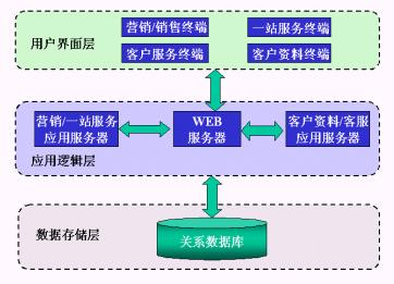數(shù)據(jù)存儲(chǔ)層中以關(guān)系模型存儲(chǔ)了營(yíng)銷(xiāo)管理、一站服務(wù)、客戶檔案與客戶服務(wù)功能模塊所需的客戶、業(yè)務(wù)數(shù)據(jù);應(yīng)用邏輯層的WEB服務(wù)器向用戶界面層的瀏覽器提供WEB訪問(wèn)服務(wù),應(yīng)用服務(wù)器上的程序完成實(shí)際的業(yè)務(wù)邏輯,并將需向前臺(tái)返回的結(jié)果從數(shù)據(jù)庫(kù)中取出,交給WEB服務(wù)器;而前端的用戶界面層負(fù)責(zé)向用戶展現(xiàn)最終的處理結(jié)果。