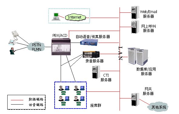 多媒體呼叫中心平臺(tái)包括:排隊(duì)機(jī)(PBX/ACD)、CTI服務(wù)器、WEB服務(wù)器、自動(dòng)語(yǔ)音系統(tǒng)(IVR/VRU)、錄音系統(tǒng)、座席終端等。