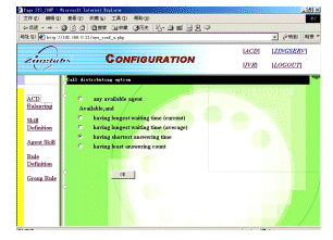 ZINGSERV具有基于WEB的配置界面,系統(tǒng)管理員注冊后,可方便完成座席分配,技能組分配等功能: