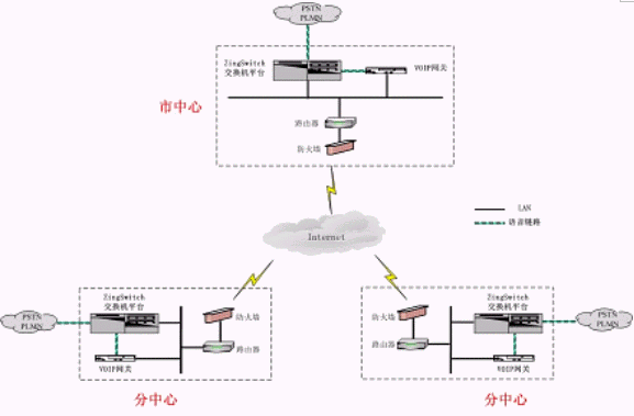 系統(tǒng)在市中心點(diǎn)和分布的遠(yuǎn)程座席所在縣市區(qū)分別部署相應(yīng)的VoIP網(wǎng)關(guān),市中心和各個(gè)縣市區(qū)都通過互聯(lián)網(wǎng)進(jìn)行連接和語(yǔ)音傳輸,客戶與遠(yuǎn)程座席之間的交流與普通的集中座席員之間毫無區(qū)別,遠(yuǎn)程座席只相當(dāng)于ZingSwitch交換機(jī)的一個(gè)遠(yuǎn)程分機(jī)。