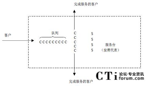 呼叫中心是一個(gè)典型的排隊(duì)系統(tǒng)。電話一個(gè)接著一個(gè)到來(lái),接受各種服務(wù)。如果一個(gè)到達(dá)的客戶(hù)不能立即接受服務(wù),這個(gè)客戶(hù)就加入到一個(gè)隊(duì)列中進(jìn)行等待,圖示是一個(gè)單隊(duì)列的排隊(duì)模型,如果呼叫中心擁有多個(gè)隊(duì)列,則需要構(gòu)造多個(gè)上述的排隊(duì)模型。