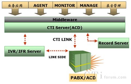聯(lián)絡(luò)中心主要由電話呼叫分配(PBX/ACD)、計(jì)算機(jī)電話集成(CTI)、交互式語音應(yīng)答(IVR)、實(shí)時(shí)錄音和自動(dòng)外撥等組成,逐漸形成了一個(gè)復(fù)雜的多系統(tǒng)異構(gòu)平臺(tái)。