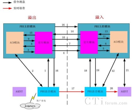 通過PBX/ACD建立一種電話路由共享和語音溢出的方法,實(shí)現(xiàn)多套聯(lián)絡(luò)中心平臺(tái)之間語音的動(dòng)態(tài)互溢,透明地為客戶提供優(yōu)質(zhì)、及時(shí)的電話服務(wù),客戶感覺不到任何差異。通過PBX/ACD建立一種電話路由共享和語音溢出的方法,作為行業(yè)現(xiàn)有實(shí)現(xiàn)方法的有效補(bǔ)充,解決了行業(yè)現(xiàn)有實(shí)現(xiàn)方法的無法實(shí)現(xiàn)最短路徑溢出問題,通過ACD的“先排隊(duì)后進(jìn)門”的預(yù)約預(yù)定模式,動(dòng)態(tài)判斷彼此的運(yùn)行狀態(tài)和處理能力,無需先將語音溢出到另外一個(gè)聯(lián)絡(luò)中心,只有當(dāng)另外一個(gè)聯(lián)絡(luò)中心確定能提供相應(yīng)的語音服務(wù)和人工服務(wù)的時(shí)候,語音才在PBX語音層面通過標(biāo)準(zhǔn)通信協(xié)議進(jìn)行互聯(lián)互通,避免實(shí)時(shí)語音被多次溢出,實(shí)時(shí)實(shí)時(shí)語音溢出只走最短路徑,保證客戶電話只需一次溢出就能立即提供語音服務(wù)和人工服務(wù),大幅減少了語音溢出的處理時(shí)間,同時(shí)也大幅減少了語音處理次數(shù),提升了系統(tǒng)處理性能。