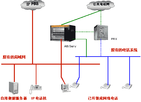 如果您不想放棄原來的交換機(jī),也可以將Altiserv接入用戶交換機(jī)的輸出端,在這種方案下,原有分機(jī)依然保留,原有布線不用改變,但是原有分機(jī)電話已經(jīng)升級(jí)為網(wǎng)絡(luò)電話。(綠色虛線為仍保留原來交換機(jī)的聯(lián)接方案)