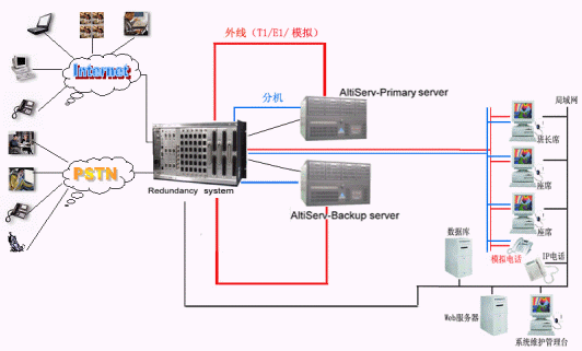 奧迪堅通訊系統(tǒng)有限公司作為CTI通訊平臺的提供商,在技術(shù)上不斷創(chuàng)新,對產(chǎn)品精益求精,尤其體現(xiàn)在對系統(tǒng)的運行安全性的要求上,為了防止電信接入設(shè)備或者企業(yè)網(wǎng)絡(luò)出現(xiàn)故障而造成的呼叫中心服務(wù)中斷,奧迪堅呼叫中心系統(tǒng)提供安全保護冗余切換系統(tǒng),來保障呼叫中心在意外情況下的正常工作,該安全冗余切換系統(tǒng)通過對電源、T1/E1、模擬trunk、分機座席、以及各種網(wǎng)絡(luò)鏈路串口等備份切換來實現(xiàn)可靠的運行。除此之外,奧迪堅系統(tǒng)本身也提供強大的安全保障,由于采用先進IP內(nèi)核一體化設(shè)計,集傳統(tǒng)PBX、CTI服務(wù)器、IVR、ACD、Recording、FAX等眾多設(shè)備于一體,這樣有效的避免了因為外掛設(shè)備過多以及設(shè)備供應(yīng)商的不同而存在的兼容性的問題,從而降低了給呼叫中心系統(tǒng)帶來的的不穩(wěn)定的安全隱患。在系統(tǒng)之外依靠安全保護冗余切換系統(tǒng),可以實現(xiàn)外線、分機、以及各種鏈路接口的雙倍安全運行。如上圖所示:兩臺奧迪堅的呼叫中心服務(wù)器和奧迪堅安全冗余切換系統(tǒng)構(gòu)成呼叫中心熱備份系統(tǒng),在兩臺服務(wù)器中安裝所有的呼叫中心功能模塊。通常情況下由主呼叫中心服務(wù)器提供系統(tǒng)的正常運行,備份服務(wù)器通過安全保護冗余切換系統(tǒng)的服務(wù)監(jiān)測模塊來監(jiān)測主服務(wù)器的各項設(shè)備和鏈路的使用情況,當(dāng)主服務(wù)器遭遇突發(fā)故障不能繼續(xù)工作時,系統(tǒng)馬上實施自動切換,就會通過安全保護冗余切換系統(tǒng)將系統(tǒng)切換到備份的呼叫中心系統(tǒng)上來,此鏈路可以是數(shù)據(jù)、語音、網(wǎng)絡(luò)、串口等。當(dāng)安全保護冗余切換系統(tǒng)自身出現(xiàn)斷電或者其他故障時,所有鏈路均保持正常工作狀態(tài)。