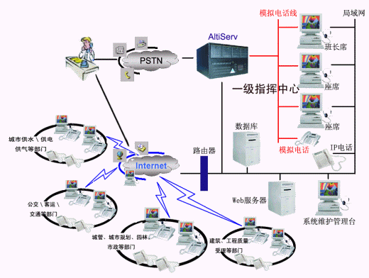 市民打電話進入12319,當一級網(wǎng)路系統(tǒng)接到市民求助時,如無法當場解決,該系統(tǒng)即迅速向二級網(wǎng)絡相關執(zhí)行單位轉達市民的求助信息。12319二級網(wǎng)絡是涉及到城市供水、供氣、供暖、市政、市容、城市交通、園林綠化、城市規(guī)劃、城市執(zhí)法、房管、環(huán)衛(wèi)、路燈、建筑市場、建筑工程質量和安全監(jiān)理等多種與市民生活關系密切的行業(yè),由市建委、規(guī)劃局、城建局、交通局、房產(chǎn)局、行政執(zhí)法局、人防辦、路燈局、自來水公司、煤氣公司、公交、客運等部門。奧迪堅針對分散的眾多部門,采用IP分布式呼叫中心技術,完全支持遠程IP座席,各職能部門的座席可以實現(xiàn)本地服務,不需要集中在12319服務中心。對于各部門IP座席來說,無需任何特殊IP模塊,只需要一臺帶有聲卡的電腦或一臺支持H.323協(xié)議的IP話機,通過Internet登錄到12319中心系統(tǒng)端,方便地處理來電和數(shù)據(jù),當接到市民的求助信息,就可以使問題迅速進入處理程序,通知下屬的專業(yè)搶修服務隊(三級網(wǎng)絡)進行搶修,在解決市民的問題同時向有關監(jiān)督部門發(fā)出相同信息,利于督辦落實。