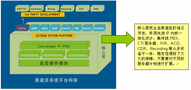 值得一提的是,在穩(wěn)定性上,奧迪堅(jiān)IP一體化呼叫中心平臺(tái)系統(tǒng)構(gòu)架,從產(chǎn)品設(shè)計(jì)之初就突破了以住基于交換機(jī)或板卡的傳統(tǒng)模式,在一臺(tái)通訊服務(wù)器上高度融合了呼叫中心的所有常用功能,有效避免了復(fù)雜的網(wǎng)絡(luò)連接和眾多的各類交換機(jī)和外掛設(shè)備,各個(gè)設(shè)備相對(duì)獨(dú)立兼容性差所給呼叫中心系統(tǒng)所帶的穩(wěn)定性欠佳的隱患。除此之外,奧迪堅(jiān)呼叫中心系統(tǒng)底層硬件模塊是在美國設(shè)計(jì)生產(chǎn)的,通過北美和中國的嚴(yán)格的電信入網(wǎng)測(cè)試;相對(duì)于硬件,平臺(tái)軟件也都是由奧迪堅(jiān)自主開發(fā)設(shè)計(jì)的,針對(duì)不同的硬件采用不同的驅(qū)動(dòng)模塊,軟硬一體在交換層又使用統(tǒng)一的邏輯接口,結(jié)構(gòu)清晰,層次合理,不僅保障了穩(wěn)定而且便于擴(kuò)展(如下圖所示),整個(gè)系統(tǒng)作為一個(gè)整體統(tǒng)一擴(kuò)展,不需要對(duì)不同的服務(wù)器分別進(jìn)行擴(kuò)展,有效避免了傳統(tǒng)呼叫中心構(gòu)建方式在擴(kuò)展方面存在的復(fù)雜性問題以及高額的擴(kuò)展費(fèi)用。