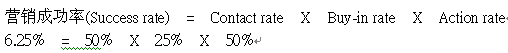rate(接觸率,能夠聯(lián)系到客戶的比率), Buy-in rate(接受率,聯(lián)系到的客戶里面表達(dá)有興趣的比率), Action rate(成交率,表達(dá)有興趣的客戶里面真正付錢購(gòu)買的比率)。一般而言,接觸率能達(dá)到50%算是不錯(cuò)的名單,而接受率能達(dá)到25%算是產(chǎn)品、名單選擇登對(duì),銷售技巧也到位,最后臨門(mén)一腳的成交率應(yīng)該要能到50%算是達(dá)標(biāo)了。以下列公式來(lái)表達(dá)(標(biāo)準(zhǔn)以上述的比率套用):
