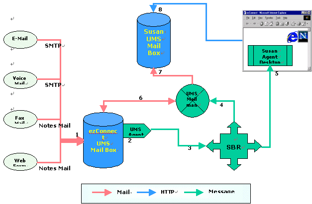 各類外部語音、郵件、WEB、傳真等信息進(jìn)入呼叫中心會(huì)以相應(yīng)的格式直接被放入ezConnect統(tǒng)一郵件服務(wù)器(1),消息經(jīng)過UMS Agent 模塊被提取出信息主題和關(guān)鍵字(2),這些主題和關(guān)鍵字被送入基于技能的路由選擇模塊SBR(3),由SBR進(jìn)行分析,選擇出最合適服務(wù)的座席(例如是Susan);之后SBR通知郵件轉(zhuǎn)發(fā)器(4)去ezConnect統(tǒng)一郵件服務(wù)器中取相應(yīng)的郵件(6),將郵件放入最佳座席(Susan)的UMS信箱中(7)(8),與此同時(shí)座席Susan的界面上顯示出她有一封新的郵件(5)。至此,完成了座席Susan 接收UMS信件的全過程。