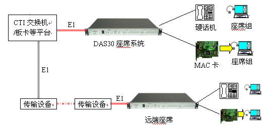 見下圖:DAS30通過1個E1接口與交換機(jī)/板卡直接連接,無需配置數(shù)據(jù),可方便地實(shí)現(xiàn)本地座席接入或遠(yuǎn)端分布式接入(需配合傳輸設(shè)備)。終端可為普通電話機(jī)或MAC座席電話卡。