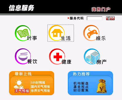在上海IPTV提供的業(yè)務(wù)中,信息服務(wù)也是眾多用戶喜聞樂見的一項(xiàng)業(yè)務(wù),內(nèi)容覆蓋廣泛。它提供了時事、生活、娛樂、餐飲、健康、房產(chǎn)等信息,其中“時事”一欄呈現(xiàn)了新浪上海熱線實(shí)時傳遞的全球最新新聞資訊,讓老百姓“手握遙控器,便知天下事”,“健康”一欄更是一網(wǎng)打盡上海地區(qū)醫(yī)療機(jī)構(gòu)的信息資訊,特色?扑阉鳛橛脩籼峁┍憬莸尼t(yī)療信息服務(wù),“房產(chǎn)”中上海地區(qū)各類二手房產(chǎn)訊息一應(yīng)俱全,價格、地段、房型等應(yīng)有盡有。