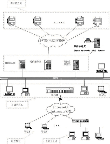 本系統(tǒng)采用最新的J2EE WEB技術(shù),在組成結(jié)構(gòu)上主要由以下三大模塊組成:1)WEB服務(wù)器: 完成用戶通過IE瀏覽器接入訪問, 傳真發(fā)送及接收的操作界面,傳真結(jié)果的查詢,客戶地址本的維護(hù)等工作;2)傳真發(fā)送/接收通信服務(wù)器:主要完成驅(qū)動(dòng)傳真板卡,通過通信線路收發(fā)傳真,檢測(cè)通信線路、對(duì)方狀態(tài),發(fā)送接收隊(duì)列管理等工作;3)數(shù)據(jù)庫服務(wù)器:主要負(fù)責(zé)用戶信息,用戶地址本信息,傳真記錄等信息存儲(chǔ)工作。