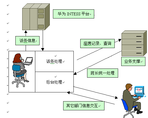 該系統(tǒng)在鐵通CRIS 平臺(tái)上運(yùn)行,前端接入采用華為CC08-A型排隊(duì)機(jī),華為INTESS平臺(tái),集成正邦高科座席軟件。完成企業(yè)業(yè)務(wù)咨詢(xún)、投訴建議的受理、產(chǎn)品訂購(gòu)、外呼調(diào)查等業(yè)務(wù),并針對(duì)各業(yè)務(wù)的特色規(guī)劃了企業(yè)的業(yè)務(wù)流程。正邦高科客戶(hù)服務(wù)系統(tǒng)的坐席軟件,和華為INTESS采用緊耦合方式將話(huà)務(wù)信息和業(yè)務(wù)信息結(jié)合在一起,便于統(tǒng)計(jì)分析,制訂客戶(hù)服務(wù)中心的運(yùn)營(yíng)策略。在后臺(tái)業(yè)務(wù)管理系統(tǒng)中,客戶(hù)服務(wù)系統(tǒng)設(shè)計(jì)了便于分析業(yè)務(wù)的一系列統(tǒng)計(jì)報(bào)表,使企業(yè)可以方便地對(duì)銷(xiāo)售過(guò)程進(jìn)行跟蹤和定單派發(fā)。