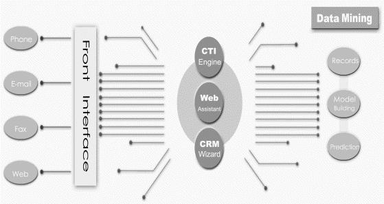 CTI.CRM共有4套功能強(qiáng)大的作業(yè)模塊組成,分別為【CTI Engine、Web Assistant、CRM Wizard 、Data Mining】,各模塊的特色功能羅列如下: