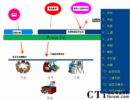 智能應(yīng)答業(yè)務(wù)是針對(duì)消費(fèi)者不便通話時(shí)的一個(gè)增值業(yè)務(wù)。當(dāng)被叫用戶有來電時(shí),因?yàn)樽约旱脑虿槐阃ㄔ挾鴴鞌嚯娫捄笸ㄟ^手機(jī)彈出的菜單,供用戶選擇與對(duì)方進(jìn)行的后續(xù)溝通。被叫用戶可以根據(jù)所處的情況選擇對(duì)應(yīng)的情景,系統(tǒng)將根據(jù)用戶選擇的情景對(duì)應(yīng)給主叫用戶發(fā)送短信和放音。智能應(yīng)答業(yè)務(wù)給了我們禮貌拒接的機(jī)會(huì)。當(dāng)您正在會(huì)議室里和客戶如火如荼的策劃下個(gè)項(xiàng)目,當(dāng)然不想被其他人打擾。突然有個(gè)電話打了進(jìn)來,接還是不接,不接有可能是一個(gè)潛在的客戶,接了又是對(duì)目前工作的一種打斷。如果你辦理了智能應(yīng)答業(yè)務(wù),當(dāng)你掛斷電話的同時(shí)手機(jī)上將出現(xiàn)一個(gè)菜單,你可以根據(jù)當(dāng)前具體情況選擇目前所處的情景(開車、開會(huì)、上課……等)。如你選擇了某種情景,系統(tǒng)將根據(jù)用戶選擇的情景,給主叫用戶播放相應(yīng)的語音通知(如:“您撥叫的用戶正在開會(huì),請(qǐng)稍后再撥”)。