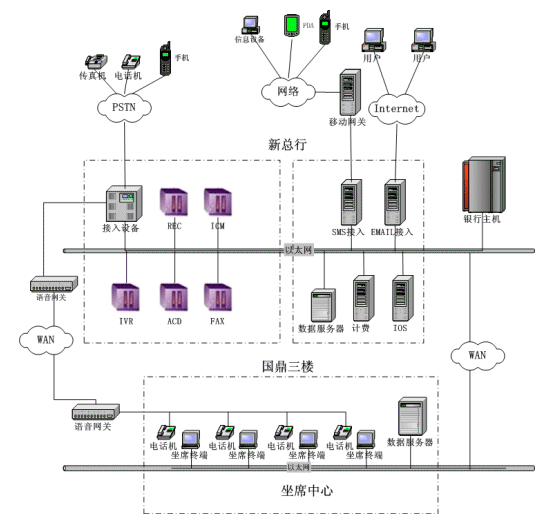 溫州商業(yè)銀行Call Center 項(xiàng)目采用基于Dialogic語(yǔ)音卡的板卡方案,由于坐席分布在兩個(gè)不同地方(新總行和國(guó)鼎),因此,采用了Intel