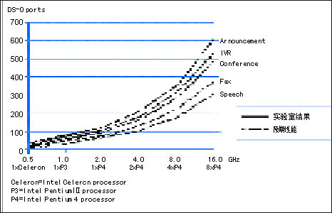 圖1顯示了主要的通信媒體處理功能的實(shí)驗(yàn)測量結(jié)果和預(yù)期性能。Intel 編制的HMP軟件,在Intel的從566 MHz 到 2 GHz的Celeron和 Pentium 處理器上,已經(jīng)對語音宣告、IVR和會議算法完成了實(shí)現(xiàn)、優(yōu)化和測試。圖1中的實(shí)線表示實(shí)驗(yàn)室中的測試結(jié)果。Intel的目標(biāo)是實(shí)現(xiàn)這些算法,并擴(kuò)展到更高速的Intel Pentium處理器,雙路、四路、甚至八路Intel Pentium處理器、Intel Xeon處理器以及Intel Itanium處理器。圖1中的虛線顯示了Intel所期望的在未來的實(shí)現(xiàn)中將得到的結(jié)果。目前,HMP的版本主要以Windows為主,很快就會推出Linux版本。從根本上說,HMP最適合用在純IP的環(huán)境,也可通過擴(kuò)展到多個(gè)服務(wù)器實(shí)現(xiàn)密度的提升。