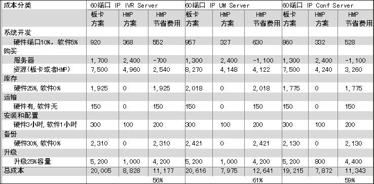 在眾多好處當(dāng)中,對用戶最有吸引力的無疑是節(jié)省成本。張怡國特別強(qiáng)調(diào),對一個(gè)應(yīng)用系統(tǒng)而言,成本的計(jì)算不應(yīng)該單以產(chǎn)品端口購買價(jià)格考核,而應(yīng)該是系統(tǒng)總的建設(shè)成本,包括產(chǎn)品購買成本、服務(wù)器成本、運(yùn)輸、安裝、庫存、升級等多項(xiàng)費(fèi)用。基于HMP1.1版本,張怡國作了一個(gè)比較,以60端口IP IVR 60、端口IP UM或者60路會議為例,和語音板卡處理方式相比,基于HMP軟件實(shí)現(xiàn)能有近60%的成本節(jié)省,其中采購能節(jié)省20%,庫存節(jié)省20%,備份節(jié)省20%,升級節(jié)省近40%。