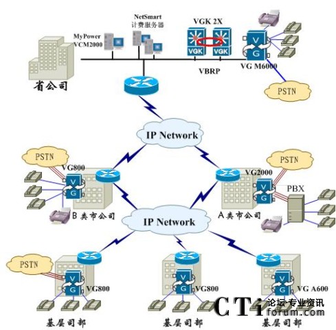 在此典型應(yīng)用中,省公司采用VG M6000,配置32FXO接入卡和E1中繼卡,實(shí)現(xiàn)大容量接入和本地PSTN落地;地市B采用VG800,配置FXO模擬接入卡和FXS模擬中繼卡,實(shí)現(xiàn)本地電話接入和PSTN落地;地市A采用VG2000,將PBX電話接入IP電話網(wǎng)絡(luò),并實(shí)現(xiàn)本地PSTN落地;基層公司根據(jù)容量需求,分別采用VG800或者VG A600實(shí)現(xiàn)電話接入。省公司配置兩臺(tái)邁普IP語音網(wǎng)守VGK 2X,運(yùn)行VBRP協(xié)議,實(shí)現(xiàn)網(wǎng)守?zé)醾洌浞直WC整個(gè)網(wǎng)絡(luò)的可靠性。