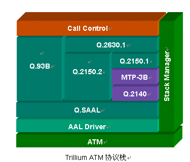 Trillium提供完整的ATM協議棧,同時支持ITU和ATM Forum的標準,相關產品包括AAL2 Signalling(Q.2630.1、Q.2150.1和Q.2150.2)、Q.93B(Q.2931)、Q.2140、Q.SAAL(Q.2130、Q.2110)、B-ISUP、VTOA、IME(ILMI 4.0)、PLOA(包括IPoA)、PNNI等。