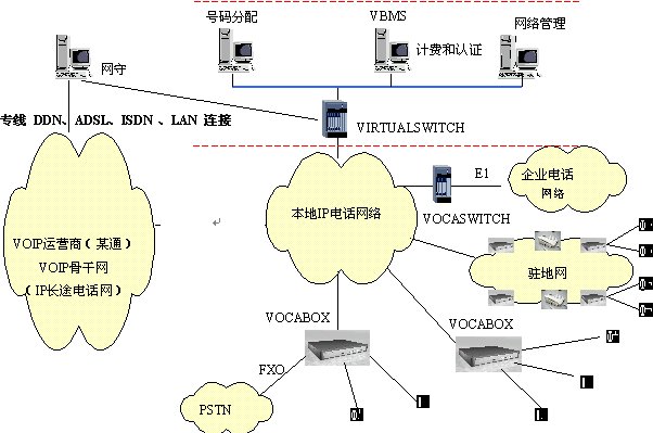 本方案中,企業(yè)電話網(wǎng)絡(luò)或者駐地網(wǎng)客戶的電話網(wǎng)絡(luò)作為大客戶通過(guò)IP方式或者通過(guò)VOCASWITH的E1端口接入到本地電話接入網(wǎng)絡(luò)。安裝VIRTUALSWITCH網(wǎng)關(guān)代理系統(tǒng),它作為整個(gè)本地電話接入網(wǎng)絡(luò)的網(wǎng)守(GATEKEEPER),以集中方式管理域內(nèi)的所有網(wǎng)關(guān)(VOCA-BOX)。