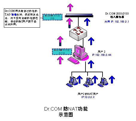 共享合法用戶的身份的NAT用戶,由于他們發(fā)出的數(shù)據(jù)包是沒(méi)有經(jīng)過(guò)封裝的,雖然經(jīng)過(guò)合法用戶的電腦實(shí)現(xiàn)了地址轉(zhuǎn)換,但Dr.COM的防代理客戶端不會(huì)對(duì)這些NAT用戶的數(shù)據(jù)包進(jìn)行封裝,所以這些數(shù)據(jù)包就在網(wǎng)關(guān)被過(guò)濾掉,代理用戶就不能正常上網(wǎng)。