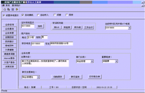 。。接通呼叫中心的電話后,按語音提示選擇相應(yīng)的服務(wù),選擇相應(yīng)的服務(wù)功能鍵后,在服務(wù)人員的計算機屏幕上自動彈出對話框顯示用戶的詳細(xì)信息。