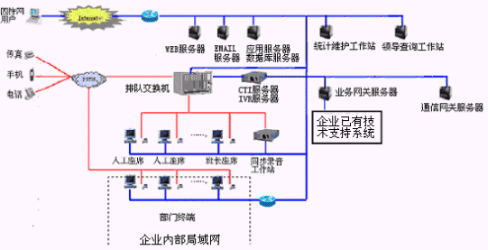 網(wǎng)上服務(wù)系統(tǒng):與INTENET結(jié)合,接受來自網(wǎng)上的呼叫請(qǐng)求,提高服務(wù)和營(yíng)銷的質(zhì)量和效率。