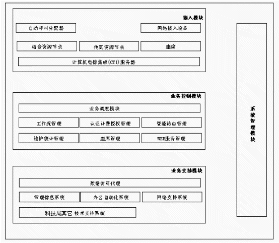 博宇公司科技局客戶服務中心的邏輯結構由以下四大模塊構成:接入模塊、業(yè)務控制模塊、業(yè)務支撐模塊、系統管理模塊,如下圖所示。其中,接入模塊、業(yè)務控制模塊和業(yè)務支撐模塊構成了整個系統軟件體系結構的三個層次,而系統管理模塊則橫貫始終。