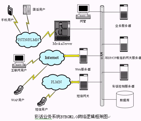 為了描述彩話業(yè)務(wù)系統(tǒng)BYBGM2.0的呼叫流程,將彩話業(yè)務(wù)系統(tǒng)BYBGM2.0網(wǎng)絡(luò)邏輯框架圖經(jīng)過(guò)簡(jiǎn)化成為下列網(wǎng)絡(luò)拓?fù)浣Y(jié)構(gòu)圖: