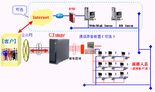 在方案中采用了由日本沖電氣(OKI)公司提供基于CTI產(chǎn)品--CTstage構(gòu)筑的UnPBX型呼叫中心,即把呼叫中心功能集成在同一臺(tái)服務(wù)器上,只需一臺(tái)PC服務(wù)器,就可在較短的時(shí)間內(nèi)簡(jiǎn)單地構(gòu)筑出一個(gè)具有完全功能的呼叫中心。