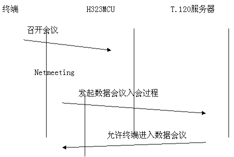 采用帶外方式,數(shù)據(jù)與音頻視頻流分開(kāi),各自占用帶寬。與終端和MCU無(wú)任何關(guān)系。如果用戶想召開(kāi)數(shù)據(jù)會(huì)議,需要單獨(dú)的一臺(tái)PC機(jī)來(lái)進(jìn)行數(shù)據(jù)的接受與傳送,所有需要數(shù)據(jù)會(huì)議功能的用戶的PC機(jī)都連接到一個(gè)T.120服務(wù)器上。目前常用的終端軟件是Netmeeting軟件。數(shù)據(jù)占用單獨(dú)的帶寬,不擠占音視頻的帶寬。會(huì)議建立過(guò)程為: