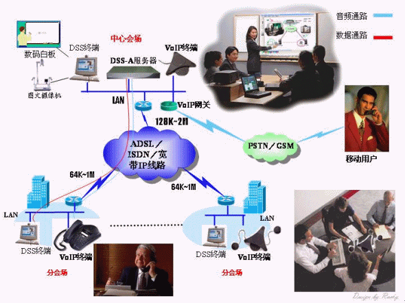DSS超媒體視訊系統(tǒng)是以主會場為中心,通過結(jié)合視頻、音頻、數(shù)據(jù)及網(wǎng)絡(luò)通訊技術(shù),同時與多個分會場進行交流,其效果如同在一間大會議室開會一樣。參與會議的成員能實時交流會議內(nèi)容(文字、圖片等),并對其進行注釋和修改。能夠高效率地進行文件傳送、方案討論、工作匯報、遠程教學(xué)等各種會議。