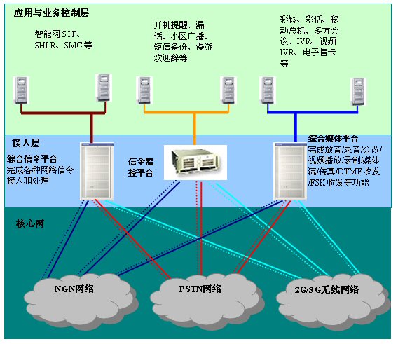 東方通信為增值業(yè)務(wù)開(kāi)發(fā)商提供了全面的接入層解決方案,同一平臺(tái)全面提供2G/3G/NGN領(lǐng)域信令、交換、媒體處理功能,系列化產(chǎn)品滿足用戶不同容量的需求。平臺(tái)在網(wǎng)絡(luò)中的位置如下圖所示: