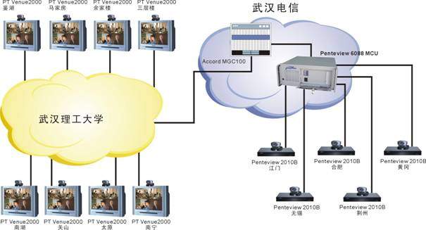 武漢理工大學(xué)的遠(yuǎn)程教學(xué)系統(tǒng)由于分3期建設(shè),網(wǎng)絡(luò)條件較為復(fù)雜。一期主要以PT的Venue2000終端+Accord MGC100 MCU為主,是一個(gè)H323系統(tǒng);二、三期采用中太多媒體的Penteview2010終端+Penteview6088MCU,是一個(gè)H320系統(tǒng),兩套系統(tǒng)通過網(wǎng)關(guān)無縫結(jié)合到一起工作,用戶根本感覺不到不同。各教室均同時(shí)采用了中太多媒體的遠(yuǎn)程教學(xué)支撐系統(tǒng),通過對(duì)Penteview會(huì)議電視系統(tǒng)的擴(kuò)充,實(shí)現(xiàn)了以下功能,使教學(xué)應(yīng)用更加方便: