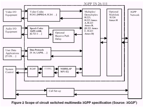 3G網(wǎng)絡(luò)上用于視頻通訊的3GPP標(biāo)準(zhǔn)定義了使用于視頻消息傳送(參看3.3部分)和視頻呼叫的視頻解碼器。在交換線路上實(shí)行64kbps速率的實(shí)時(shí)呼叫時(shí),H.263是推薦標(biāo)準(zhǔn),如圖2所示?蛇x的其他視頻解碼器中,MPEG-4和H.261不是標(biāo)準(zhǔn)所要求的,但可作為可能的候選標(biāo)準(zhǔn)。