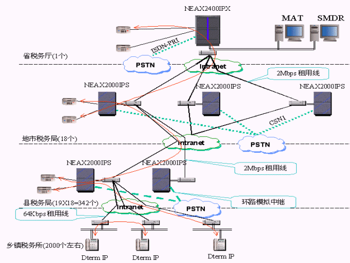 NEC公司為該省稅務(wù)提供了2003年全球同步推出的NEAX 2400及NEAX2000交換機(jī)系統(tǒng),為用戶提供了傳統(tǒng)時(shí)分交換系統(tǒng)和VoIP交換的完美結(jié)合,即具備VoIP功能又支持交換機(jī)的豐富功能,如豐富的終端,豐富的組網(wǎng)中繼和信令,語音信箱,多方會議,無線通信,統(tǒng)一計(jì)費(fèi)等等。