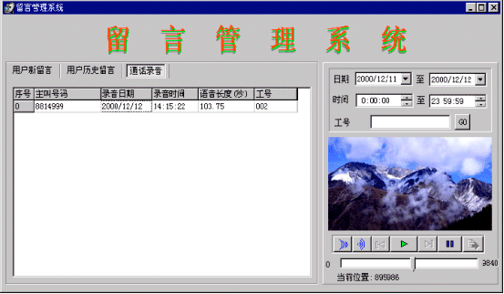 當系統(tǒng)中無話務員登錄或等待超過20秒,則進入語音信箱服務。語音信箱在進入時提示用戶:“系統(tǒng)正忙,請留下您的聯(lián)系電話,復本機號請掛機,復其他號碼請輸入電話號碼,按‘#’號鍵結束,或者在聽到‘嘟’的一聲之后留下你的留言”,當主叫號碼位數(shù)不夠7位時,提示:“系統(tǒng)正忙,請輸入您的聯(lián)系電話,按‘#’號鍵結束,或者在聽到‘嘟’的一聲之后留下你的留言”,系統(tǒng)將客戶留下的電話號碼記錄到數(shù)據(jù)庫中。將留言存放到一個指定目錄中,用話務號作為語音文件名。