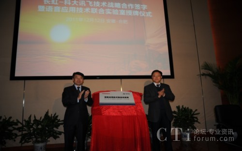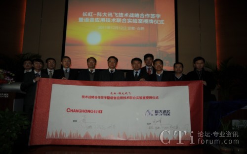 CTI論壇(ctiforum)12月14消息(記者 潘婷婷): 12月12日,科大訊飛與長虹集團(tuán)戰(zhàn)略合作簽約暨共建聯(lián)合實(shí)驗(yàn)室揭牌儀式在科大訊飛語音產(chǎn)業(yè)基地研發(fā)大樓隆重舉行。根據(jù)合作框架協(xié)議,雙方將在戰(zhàn)略聯(lián)盟的基礎(chǔ)上,以共建聯(lián)合實(shí)驗(yàn)室為主要載體,旨在依托各自行業(yè)領(lǐng)域的長期積淀優(yōu)勢、強(qiáng)強(qiáng)聯(lián)合,達(dá)成戰(zhàn)略互信,加強(qiáng)緊密合作,積極推動(dòng)“語音核心引擎+智能終端平臺” 的特色應(yīng)用模式,深入拓展智能語音科技在智能電視等終端產(chǎn)品市場的應(yīng)用范圍,合力開創(chuàng)智能語音終端創(chuàng)新應(yīng)用市場空間。