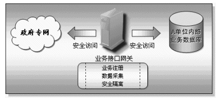 為了實(shí)現(xiàn)企業(yè)基礎(chǔ)信息交換與共享,各個(gè)接入平臺(tái)的單位必須將需要提供給其他單位的企業(yè)數(shù)據(jù)共享出來(lái),基于安全、保密等多種因素考慮,這些單位的業(yè)務(wù)數(shù)據(jù)庫(kù)不可以也不應(yīng)該對(duì)其他單位完全開放(也就是直接連在政府專網(wǎng)上),而業(yè)務(wù)接口網(wǎng)關(guān)的作用就是將業(yè)務(wù)數(shù)據(jù)庫(kù)與政府專網(wǎng)之間的隔離、實(shí)現(xiàn)業(yè)務(wù)注冊(cè)以及數(shù)據(jù)采集等功能。業(yè)務(wù)接口網(wǎng)關(guān)的兩個(gè)網(wǎng)絡(luò)端口分別連接業(yè)務(wù)數(shù)據(jù)庫(kù)以及政府專網(wǎng),機(jī)關(guān)單位將它們業(yè)務(wù)數(shù)據(jù)庫(kù)中需要共享的業(yè)務(wù)數(shù)據(jù)項(xiàng)名稱注冊(cè)到信息中心的業(yè)務(wù)注冊(cè)庫(kù)中,其他機(jī)關(guān)單位通過(guò)查詢業(yè)務(wù)注冊(cè)庫(kù)獲取對(duì)方單位的業(yè)務(wù)注冊(cè)信息,并通過(guò)自己的業(yè)務(wù)接口網(wǎng)關(guān)向信息交換機(jī)發(fā)出業(yè)務(wù)數(shù)據(jù)采集的要求,信息交換機(jī)接收請(qǐng)求后對(duì)請(qǐng)求進(jìn)行校驗(yàn),校驗(yàn)通過(guò)后信息交換機(jī)會(huì)通過(guò)被采集業(yè)務(wù)數(shù)據(jù)庫(kù)所在單位的業(yè)務(wù)接口網(wǎng)關(guān)獲取業(yè)務(wù)數(shù)據(jù),數(shù)據(jù)通過(guò)信息交換機(jī)交換到采集單位的業(yè)務(wù)接口網(wǎng)關(guān),此時(shí)采集單位可以將數(shù)據(jù)保存在己方的采集數(shù)據(jù)庫(kù)中,或者直接由應(yīng)用系統(tǒng)使用。